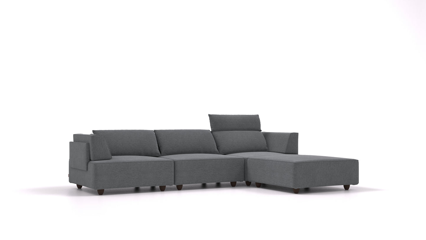 Naslone CasCais sedežne garniture lahko prestavljaš po elementih. Pod šivom so na sedalnih elementih skrite luknje, v katere se zatakne oporni naslon za blazine. Na največjem L elementu so luknje za namestitev dveh naslonov na eni od daljših stranic, krajši stranici imata vsaka prostor za enega. Kvadratni K element ima prostor za eno naslonjalo na dveh sosednjih stranicah in pravokotni element F na eni od krajših stranic. Naslone lahko po potrebi tudi odstraniš in jih pospraviš v shranjevalni prostor na dnu garniture.